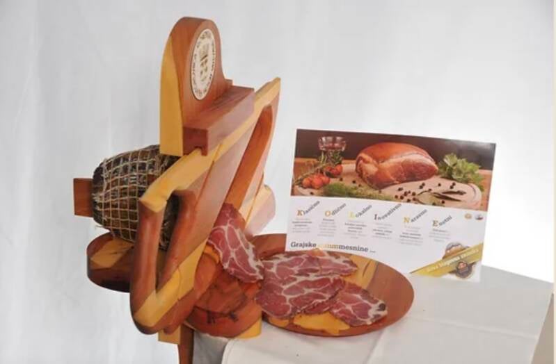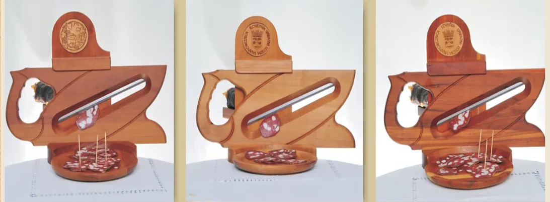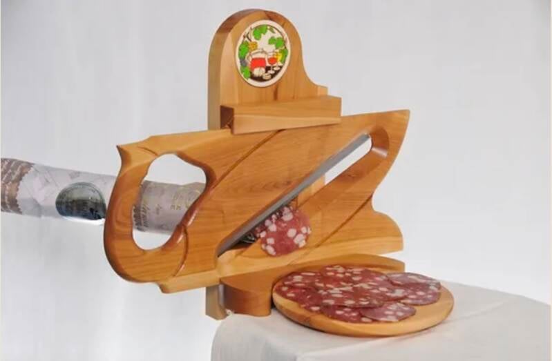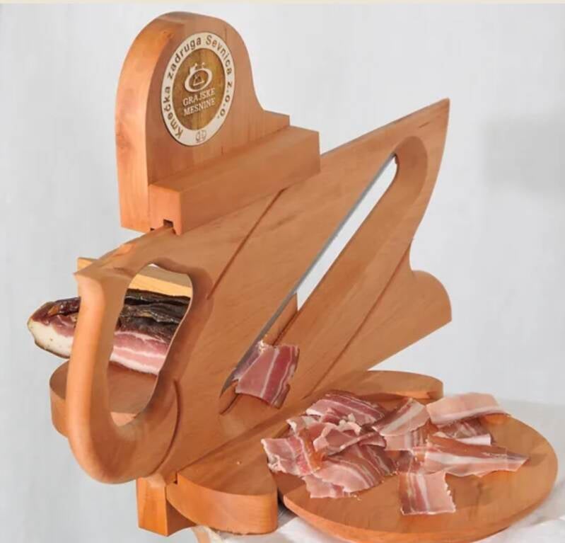 Salamoreznica izdelana iz slovenskega lesa slive, češnje in hruške. Za rezanje suhe salame, slanine, budjole, savinjskega želodca, šinka, delikatesnega pršuta in ostalih suhomesnatih dobrot.